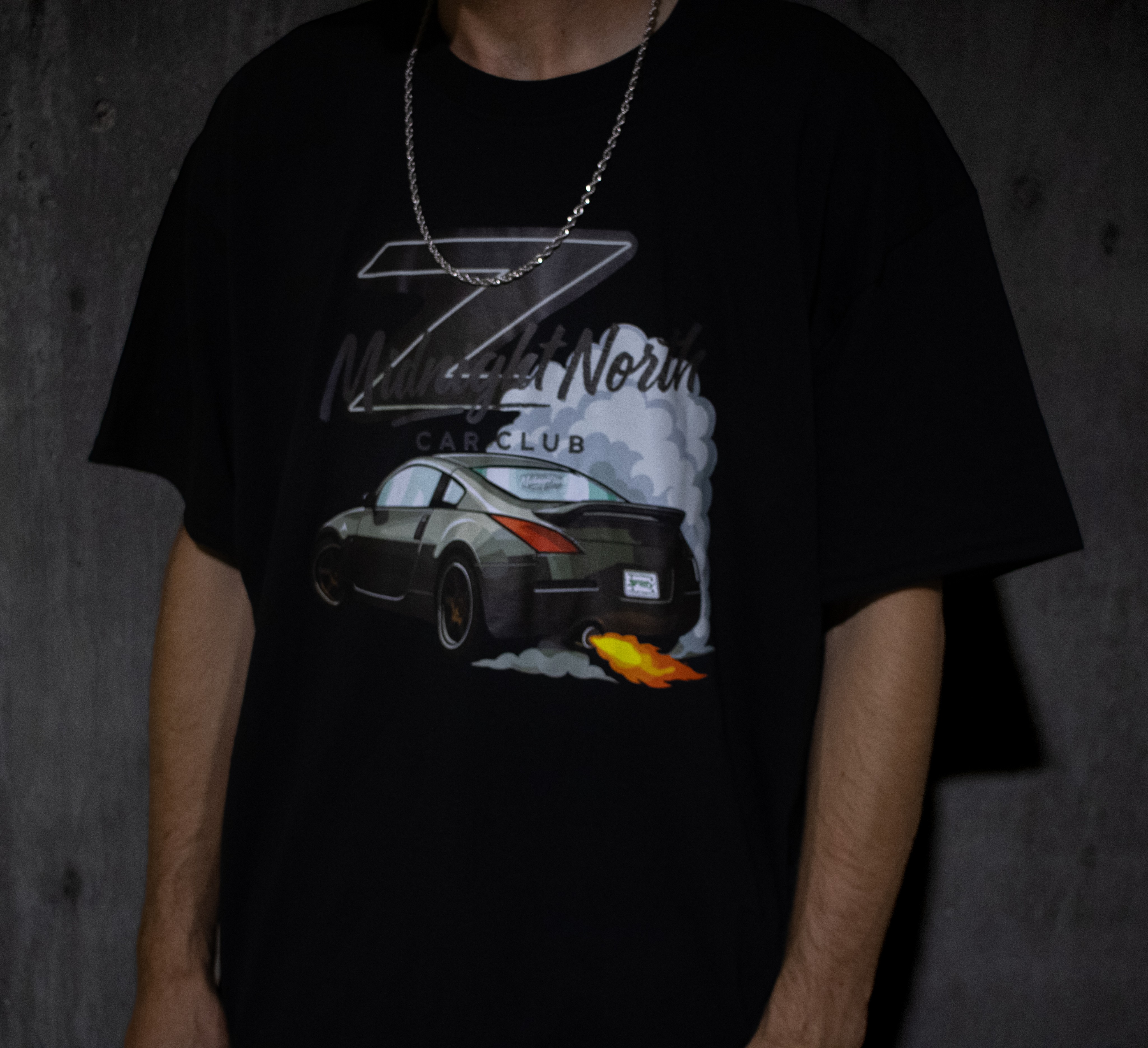 Limited edition Fitty Z design featuring the iconic Nissan 350Z with flames and Midnight North Club branding. Pre-order secures your spot!